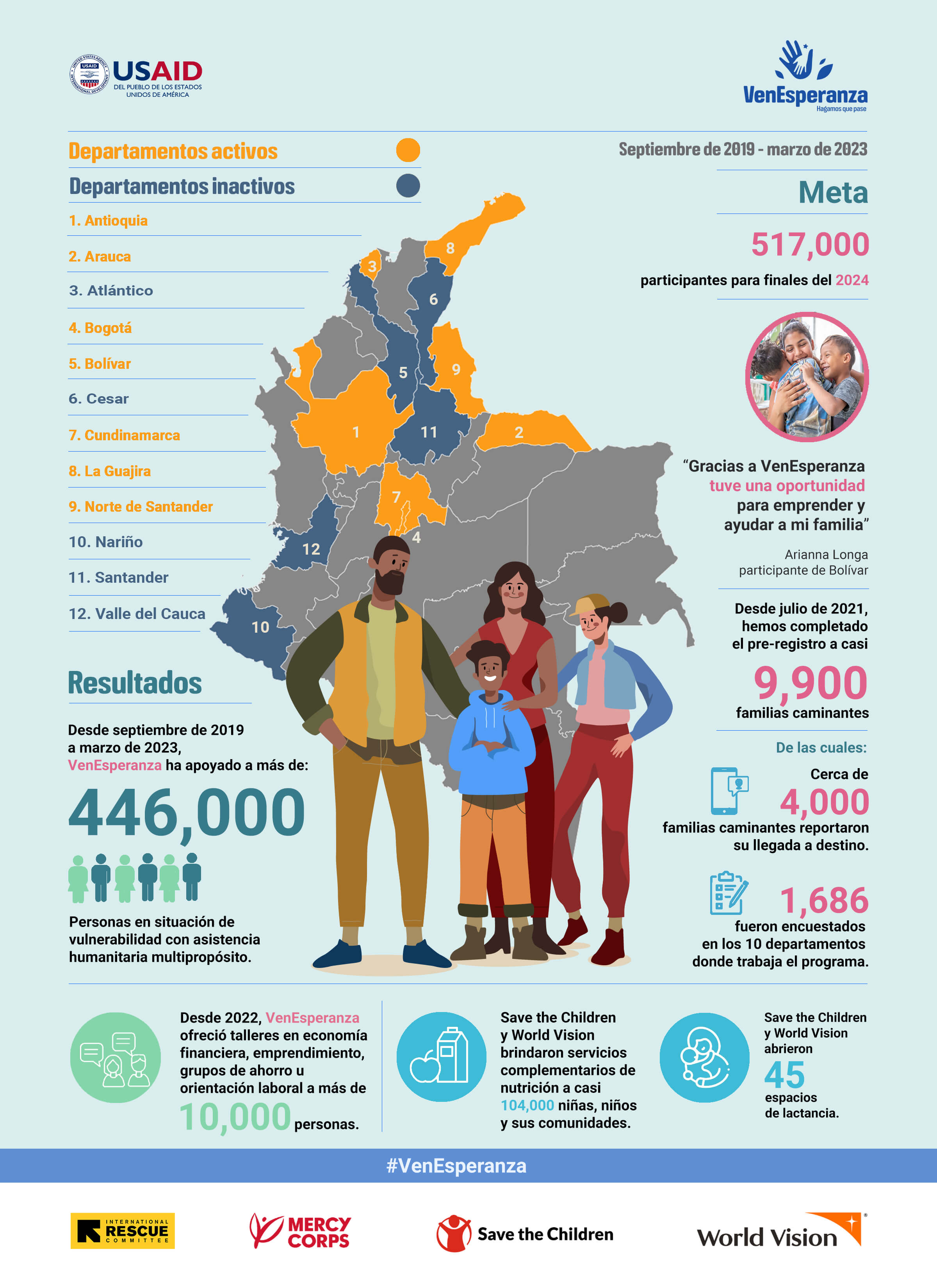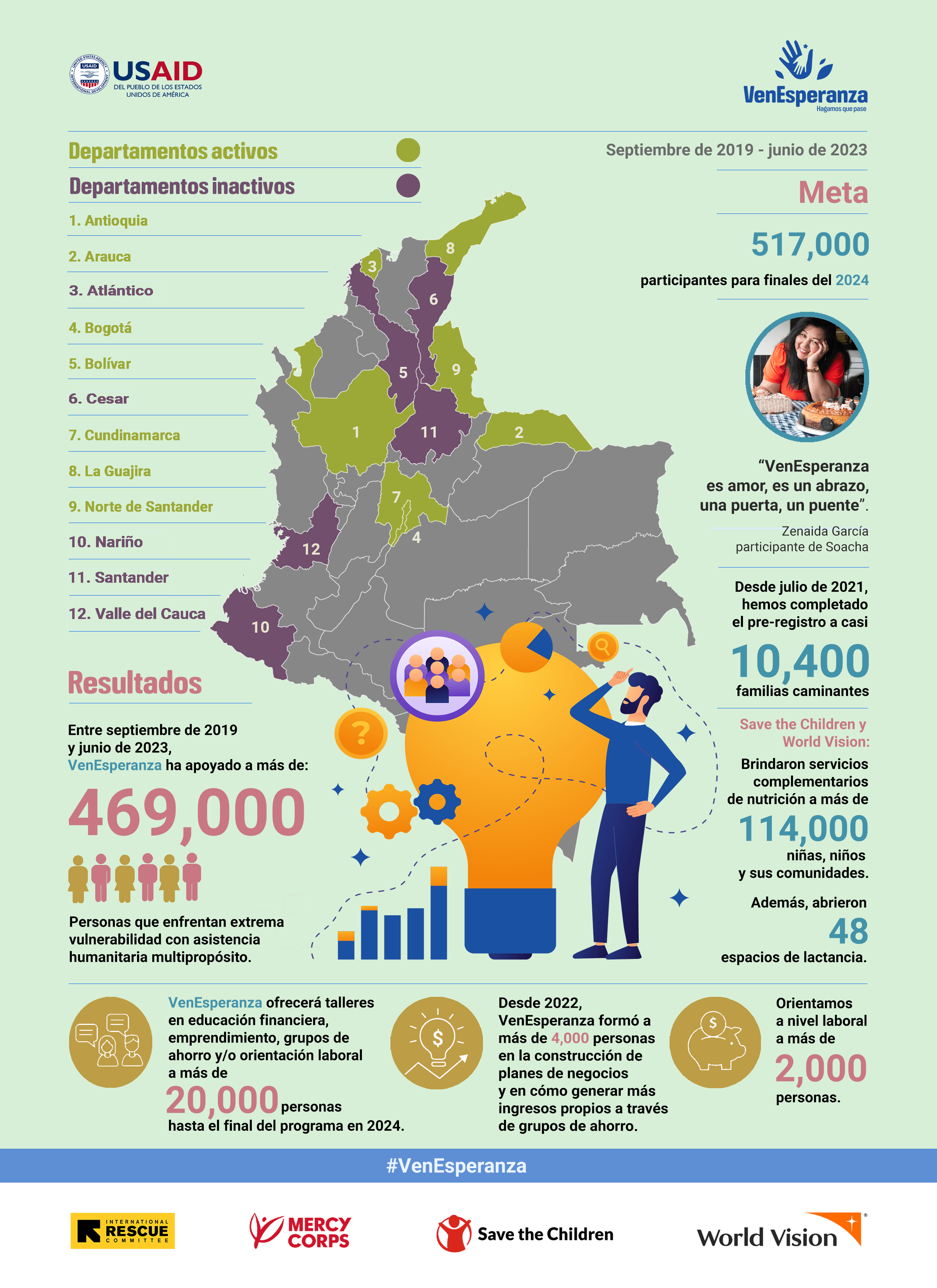 Durante el programa VenEsperanza, en el marco de la respuesta a la crisis migratoria, adelantamos acciones de atención humanitaria enfocada a niñas, niños, jóvenes y personas adultas migrantes venezolanos, colombianas retornados y comunidades de acogida en 10 departamentos de Colombia